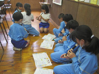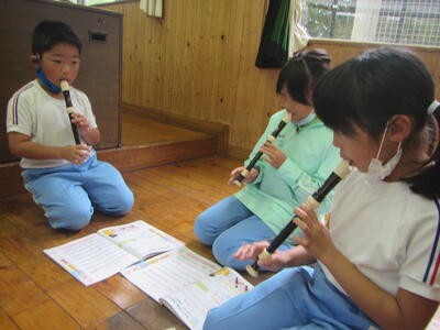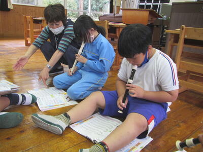 リズムと一緒に楽しそうな声が聞こえてきます。教室をのぞくと、「歌って手遊びできるようになろう」というめあてで、ペアになり、音に合わせて、真剣に?手遊びしていました。