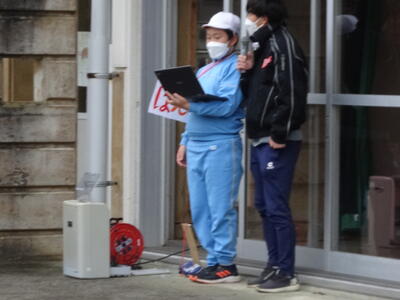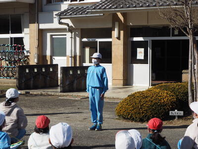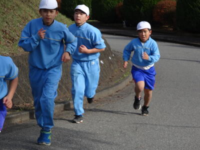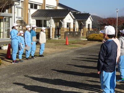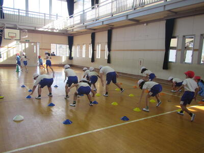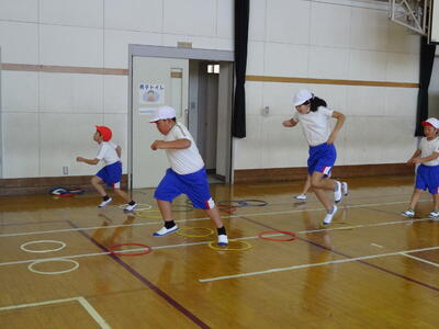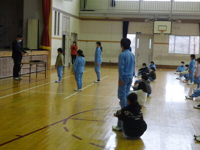 下学年は体育館で、上学年は、坂道から前庭で行いました。