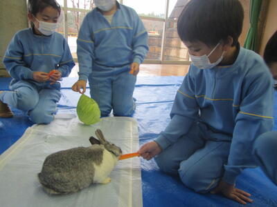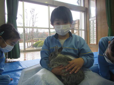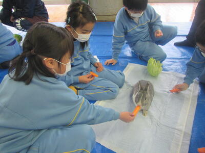 獣医師の先ウサギ5匹をつれて来校しました。一人一人交代で、ウサギを抱いたり、餌をあげたりしました。