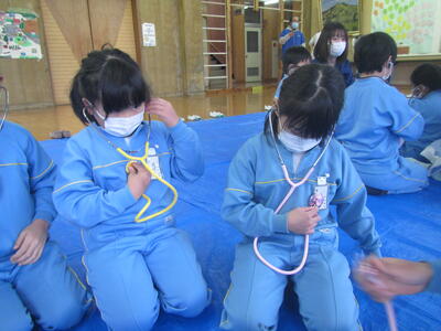 また、聴診器を使って、自分の心音やウサギの心音を聞いて、比べてみたりするなどの体験を行いました。