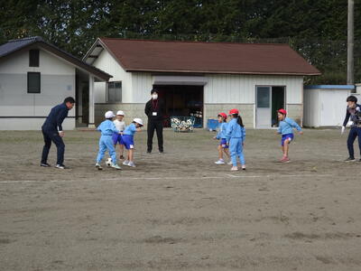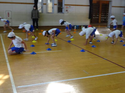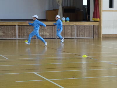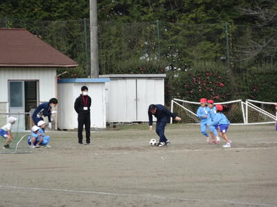 1・2年生がボールけりゲーム(ミニサッカー)でボールの蹴り方を練習していました。うまく蹴れないことも多いですが、楽しくボールを蹴っていました。