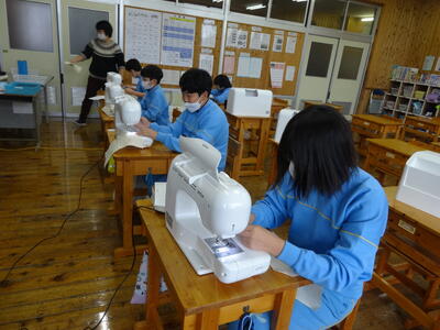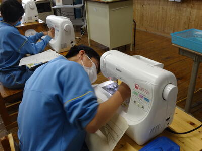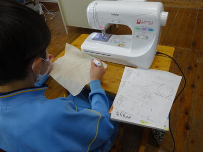 ミシンを使う学習をしていました。準備をして、いざ試し縫い。うまく縫えたかな。目指せミシン名人!!