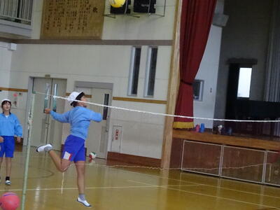4年生の体育はキャッチバレーボールを行っています。今日は、スパイクの練習をしていました。