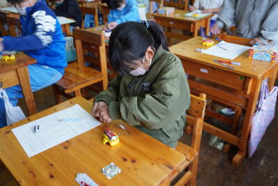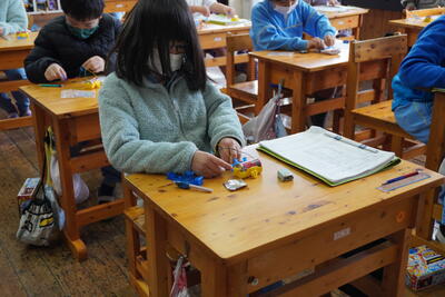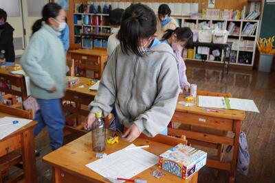 理科教材キットで作ったテスターを使って、電気をとおすものと通さないものを調べる実験をしていました。友達とも協力しながら、結果を記入し、わかったことを話し合いまとめました。