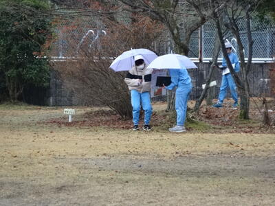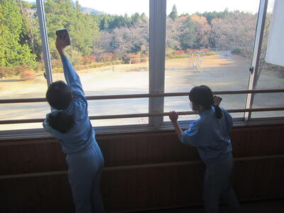 今日の気温が下がり、冬らしくなってきました。1年生が校庭で冬探しをしていました。
