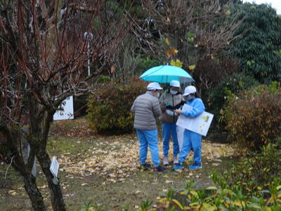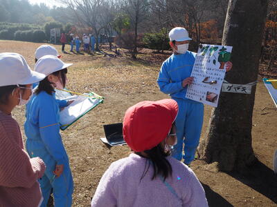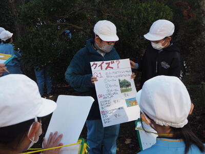 クイズも作成するなど、工夫して説明していました。今年のチェックポイントになった樹木は、ソメイヨシノ、キンモクセイ、モチノキ、オニグルミ、イチョウ、サルスベリ、ヒノキ、ケヤキ、イロハモミジ、ザクロです。