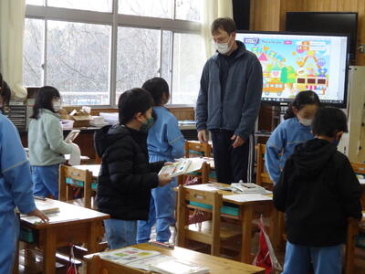 1年生もALTと一緒に外国語活動を行います。3年生からは、週1回の時間ですが、1,2年生は年に数回です。