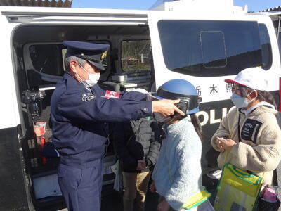 茂木警察署では、警察の仕事について学習しました。警察官が身につけている物、道具などで差し支えないものを見せて、触らせていただきました。最後に今日は,事故処理車を見せていただきました。パトカーと同じように赤色回転灯を回しながら,大きな音で素早く事故現場に駆けつける車です。車の中の道具も見せていただきました。質問にも丁寧に答えてくださいました。茂木警察署の方、ありがとうござました。