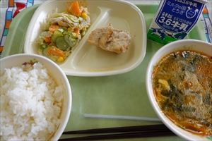 わかめごはん 牛乳 とりのからあげ 中華風春雨サラダ