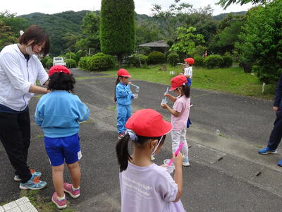1年生がシャボン玉をとばしていました。ストローを使ったり、モールで作った道具を使って、工夫しながらかつづしていました。