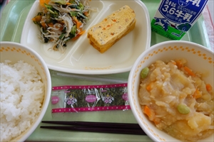 ごはん 牛乳 五目厚焼き玉子 じゃこサラダ ジャガイモのそぼろ煮 味付のり