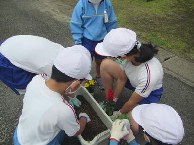 焼森班ごとに、プランターに土を入れ、マリーゴールドとサルビアを