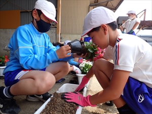 業間から3校時にかけて、5・6年生は、レンタルプランター用の寄せ植え作りをするために、山形園芸に行き作業をしてきました。今年度も、できあがった寄せ植えを学校でしばらく世話をした後、地域でお世話になっている次の5か所に届ける予定です。