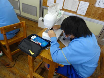 ミシンを使う学習をしていました。準備をして、いざ試し縫い。うまく縫えたかな。目指せミシン名人!!