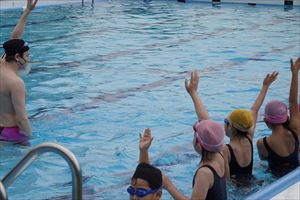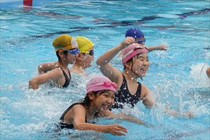 1・2・3年生は、2校時、水泳の授業でした。梅雨の合間のとてもよい天気のもとで行われました。。水の中でジャンケンをしたり、バタ足を練習したりしました。先生の話をよく聞きながら、楽しく学習することができました。学校全体に、子どもたちの元気な声が響き渡りました。
