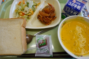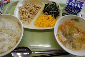 三色ごはん 牛乳 白菜とエビボールのスープ