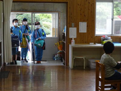 あいさつ運動の様子です。1、2年生の教室に行って、あいさつを呼びかけています。