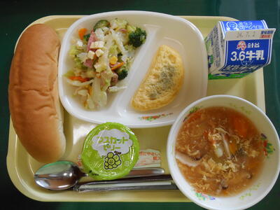コッペパン、ミルククリーム、ほうれん草オムレツ、イタリアンサラダ、トマト入りようふう玉子スープ、マスカットゼリー、牛乳