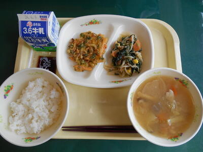 ごはん、いわしのしょうが煮、野菜の玉子あえ、けんちん汁、牛乳