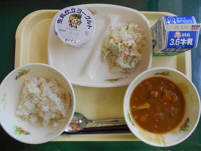 栃木県産大麦ごはん、豆入りチキンカレー、コールスローサラダ、県産ヨーグルト、牛乳