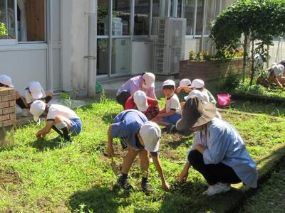 ホームページを見た地域の方が、朝の除草に来てくださいました。今回は、子どもたちは主に学年の花壇の除草をしており、地域の方と同じ場所を除草をすることはありませんでしたが、あいさつをしたりお礼を言ったりと、関わる姿が見られました。地域の方の姿や力が、子どもの心の豊かさにつながっていると感じました。暑い中のご協力、ありがとうございました。