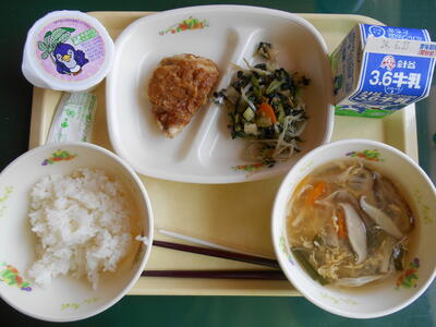ごはん、もろのこうみソース、かんぴょう入りいそべあえ、茂木町産にらのかきたま汁、県民の日デザート、牛乳