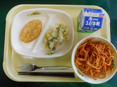 スパゲティナポリタン、ハッシュドポテト、コーンサラダ、牛乳