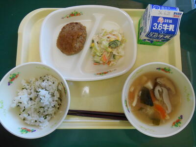 わかめごはん、ハンバーグおろしソース、ツナサラダ、こんさいのみそ汁、牛乳