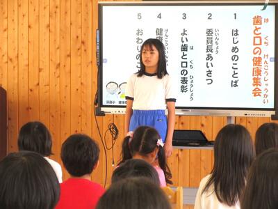 6/24(月)の業間に、健康委員会が中心となって行いました。最初に、歯科検診で歯と口が特に健康と診断された29人を表彰しました。各学年とも半数以上が表彰されました。そのあと、歯に関する〇✕クイズを行いました。児童は全問正解を目指してクイズに取り組んでいました。