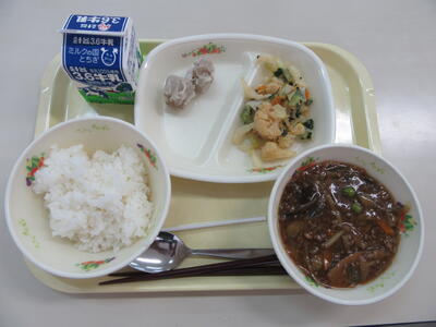 ごはん、シュウマイ(2)、小松菜の中華サラダ、マーボー茄子、牛乳