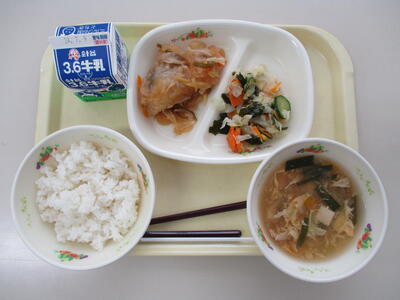 ごはん、白身魚の南蛮漬け、海藻サラダ、かきたま汁、牛乳
