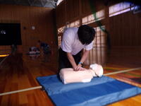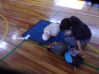 心肺蘇生法研修では、教職員一人一人が、負傷者の発見からAEDの使用までの流れを実際に行って確認しました。