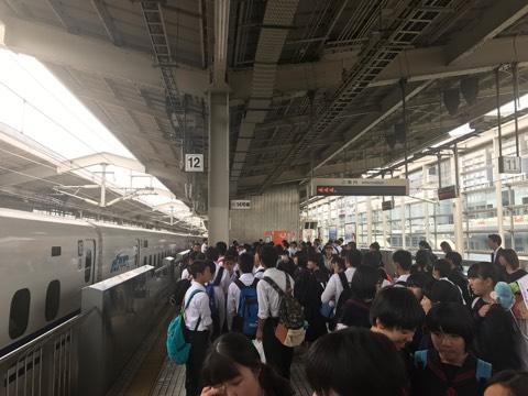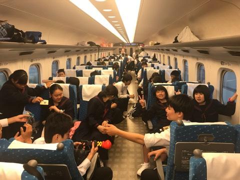 新横浜を出ました。疲れて寝ている生徒もいますが、まだまだ元気いっぱいの生徒たちです。