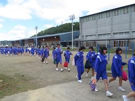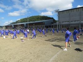 校庭で準備運動をして、パシフィックスポーツプラザに出発しました。