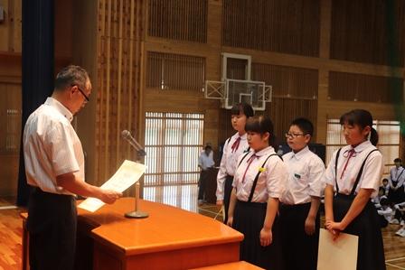 本日は、表彰がありました。大きな返事の声が響き渡りました。