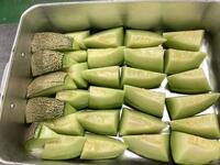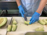 今日の給食の写真です。カレーには、ナスやトマト等の夏野菜がたくさん入っていました。さすがは好きな給食ランキング1位のカレーライスです。食べ終わった後、おかわりをする子たちも多くいました。また、デザートのメロンも、多くの子たちが喜んでいました。メロンは、調理員の方々が写真のように一つ一つ丁寧に切り分けています。感謝の気持ちをもって、これからの給食も楽しんでほしいです。