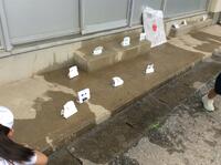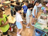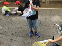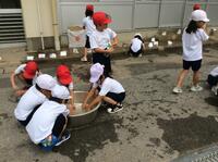 生活科の学習で、身近にある物を使って水遊びをしました。家からケチャップやソースの空き容器を持ってきて、自分で穴を開けるところを決め、水鉄砲を作りました。自分で作った的に向かって狙いを定める姿がたくさん見られました。また、地面に絵を描いたり、文字を書いたりして友だちと楽しむ姿も見られました。作った容器を使って家でもたくさん遊んでくれると嬉しいです。