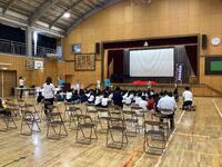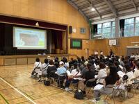 本日、5年生は社会科の学習で株式会社クボタさんご協力の下、オンライン工場見学を体育館で行いました。工場で農業に使うトラクタがつくられる様子を中心に見学をしました。工場での作業を真剣に見る児童や、イラストを加えながら必死にメモを取っている児童の姿が印象的でした。質問コーナーでは、各クラスの児童から 「年間どれくらいの数の機械を作っていますか。」や「日本以外にどこに輸出していますか。」など、映像だけでは分からないことも学習できました。社会科の「米作りのさかんな地域」の学習に加え、総合的な学習の時間で行っている米作りとも関連させながら本日の学びを深めていきます。