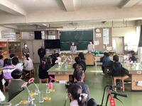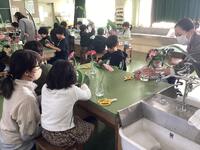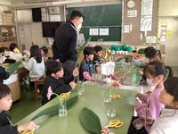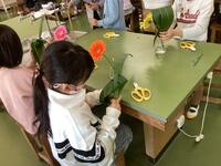 本日、2,3,4時間目に理科室で花育の授業が行われました。小学生にお花と触れ合う機会を持ち、少しでもお花に興味を持ってほしいという県の取り組みにより、花育の授業を行っていただくことができました。花育の授業では、お花についてのクイズに答えたり、生け花の体験をしたりしました。生け花の体験では、「一花一葉」ということで、ガーベラの花とハランの葉を使って生け花を行いました。葉を裂いたり、巻いたり、結んだりしながら一生懸命花を生けようとする姿が見られました。自分が生けた花を持って帰れると聞いたときにはどの児童もとても喜んでいました。家でもきれいな姿を維持できるよう、心を込めてお世話をしてほしいですね。