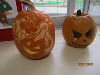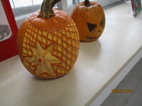 そして、昇降口前には実際にカボチャを彫ったランタンがあります。