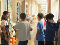 マスクをしないで咳やくしゃみをしたときにはどこまで飛沫が飛ぶのか、実際にスズランテープを使って示すと、子ども達から驚きの声が・・・。
