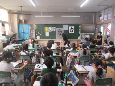 「力」という文字の書き方を練習しました。筆の扱いにまだ慣れていない子ども達ですが、藤井先生が目の前で書いて教えてくれるのを真剣なまなざしで見ていました。その後、自分で書くときには、一生懸命教えられた用に書こうとしていました。普段とは、書くときの姿勢も違っていて、背筋がしっかりのびていました。
