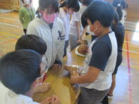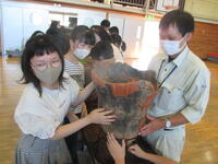6年生が、体育館で考古学教室を行っていました。