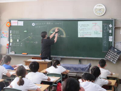 分度器を使って角度を測る学習でした。180度より大きい角度をどうやって測るか、子ども達は智惠を絞っていました。