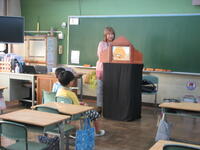 3年生がリコーダーの講習会を行いました。小学校3年生から音楽の授業などで学習するリコーダーを講師の先生から教わりました。講師の先生にお話しを聞くと、このような講習会のために昨年は180校以上の小学校を訪問し、リコーダーの基本や魅力を伝えているということです。子ども達が学習に用いるのはソプラノリコーダーですが、他にもソプラニーノ、アルト、テナー、バス、グレートバスなどがあり、実物のリコーダーを1つ1つ取り出して、音の違いや魅力などを教えていただきました。音域が低くなるほど、楽器のサイズは大きくなりますが、今回最も大きいサイズは1mにもなる大きバスリコーダーでした。子ども達もその魅力に目を輝かせていました。