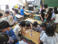 天気が優れない日が続いていますが、1年生は外で水遊び。ペットボトルで作った水鉄砲などで、互いに水のかけあいをしていました。先生も子ども達もびちょびちょでしたが、楽しそうな笑顔が校庭に広がっていました。天候不良で日差しがない分、暑くもなく絶好の水遊び日和でした。
