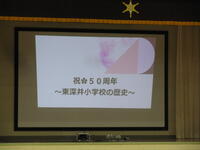 東深井小学校創立50周年をお祝いして、児童会が主体となって50周年祭が行われました。”深小シンフォニー”(5・6年生)によるリコーダー等を使った演奏、アンサンブルの発表、そして全校児童による校歌などが行われました。また、東深井小50年の歴史を振り返るスライド、”深小クイズ”など子ども達の思考をこらしたプログラムが行われました。また、東京理科大の学生さんの協力のもと、”深小EARTH”と題したプロジェクションマッピングが行われました。この日のために子ども達が海・森・サバンナ・日本・世界の都市をテーマにした絵を描き、それらを活用した動画を作成し上映してくれました。子ども達も大興奮の一大イベントになりました。最後は全校合唱で♪ふるさと♪を歌い、「これからも東深井小を母校として頑張っていきましょう」という話で締めくくられました。東深井小の児童達による本当に素晴らしい会でした。
