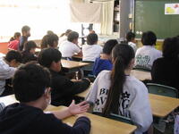 6年生では、国際理解教育の講師の先生に現在19歳の方をお迎えしました。小学校4年生の頃に海外留学に憧れ、初めてアメリカに渡ったそうです。中学校は日本の中学に通ったそうですが、中学3年生の時にまたアメリカに。それからアメリカで生活をしていて、今は大学入学前ということで日本に帰ってきているということでした。はじめは英語もほとんどわからなかったそうですが、勉強するにつれて、どんどん世界が広がっていったそうです。留学先では、日本語を一切使わないようにすることで英語脳を作っていったということです。今ではアメリカだけではなく様々な国の人と英語という共通言語を使ってコミュニケーションをとって、アメリカでの生活を満喫しているようです。講演の中では、日本とアメリカの給食の違いなども紹介してくれました。アメリカに行ったことで、以前よりも日本が好きになったとも話していました。
