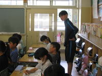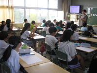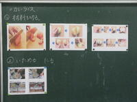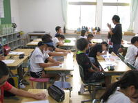 今日から1~3年生は5校時まで、4~6年生は6校時までの授業になります。校内の雰囲気としては、夏休み気分も終わりになってきたかなという状況です。今日は、授業に中学生が入りました。職場体験学習で来ている中学生です。将来は先生なりたい(?)とか。3年生と5年生の教室に入って、体験していました。また、4年生の図工の授業では版画のアイデアスケッチをしており、見本を見ながら「どうしようかなぁ」といろいろ考えていました。発想の豊かさがとても面白いです。