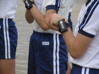 腕に腕時計のようなデバイスを付けて体育の授業に取り組んでいました。これは1学期から準備を進めてきた体育の授業におけるICTの活用の一環で試行しているものです。子ども達一人一人の心拍数を読み取って、リアルタイムで運動の強度などをモニタリングできるもので、これからどう活用していくか楽しみです。今日は鉄棒で前回りなどを行い、心拍数が誰もが100を超えるような値を示していました。体育の授業にもスポーツ科学的なことがどんどん入ってくるかもしれません。